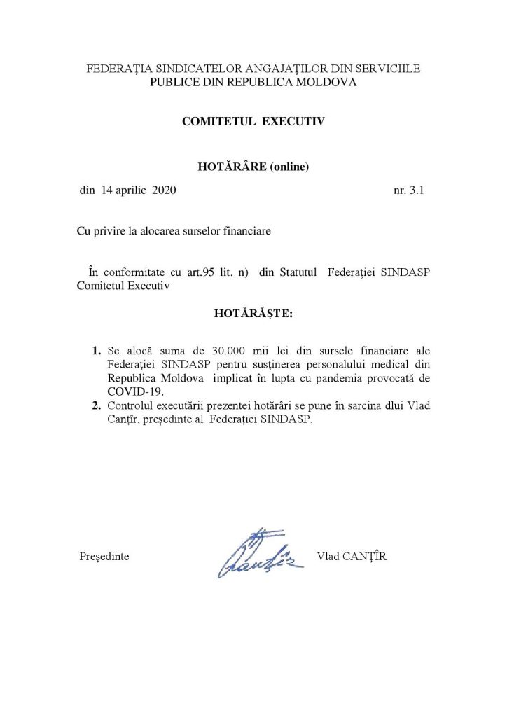 Mai jos, hotărârea Comitetului Executiv nr.3.1 din 14 aprilie 2020 cu privire la alocarea susrselor financiare din contul Federației pentru susținerea personalului medical din Republica Moldova, implicat în lupta cu COVID-19.