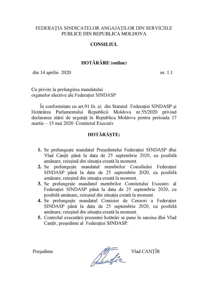 În urma hotărârii Consiliului Federației SINDASP nr.2.1 din 22 martie 2020 cu privire la prelungirea mandatului organelor elective ale Federației SINDASP, din 48 de membri ai Consiliului au votat : 44 – pro, 1 – contra și 3 membri – sau abținut.