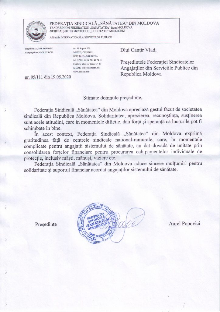 Mesaj de gratitudine adresat Federației SINDASP în lupta cu pandemia COVID-19