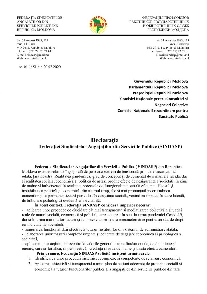 Vineri, 14 august, curent, domnul Vlad Canțîr, Președintele Federației Sindicatelor Angajaților din Serviciile Publice din Republica Moldova (SINDASP), a întreprins o vizită de lucru în raionul Ștefan Vodă. În cadrul ședinței, cu respectarea tuturor rigorilor impuse de regimul pandemic, au participat Vicepreședinții raionului doamna Valentina Barbei și domnul Vladimir Baligari, primarii și secretarii consiliilor locale, dar și liderii de sindicat a Asociației Sindicale Ștefan Vodă din cadrul Federației SINDASP, în frunte cu domnul Președinte Ion Mustafenco. Motivul intervenției sindicatului în raion a fost determinat de necesitatea stringentă de reactualizare a conținuturilor contractelor colective de muncă, de formele de organizare și desfășurare a unor seminare de formare în contextul modificărilor normative din cadrul legal, de situația tensionantă produsă de efectele unor forme de control al unor instituții de stat abilitate cu capacitate de control în primăriile din raion, precum și de consecințele și efectele produse de răspândirea virusului Covid-19. Participanții la ședință s-au expus asupra necesităților urgente de modificare și actualizare a unor elemente de conținut din CCM la nivel de unitate, în contextul modificărilor din legislația moldovenească, dar determinate și de realitățile pandemice specifice și deosebit de pronunțate prin care trece fiecare primărie și întregul raion. Concomitent, primarii și secretarii consiliilor locale și-au exprimat nedumerirea și indignarea, legate de faptul că raionul Ștefan Vodă este la moment unicul raion din țară, cu majoritatea primăriilor, care este supus unui control exagerat de riguros și nepotrivit pentru această perioadă de pandemie, răspândită pronunțat în regiune. De menționat că aceste verificări de corectitudine legală în activitățile unor primării din raion se face tendențios pe doar anumite subiecte, iar rezultatele, pe alocuri nemotivate legal cu suficientă consistență, produc efecte de instabilitate morală și, în mod special, de tulburare psihologică pronunțată a angajaților din administrația publică de nivelul întâi. În plus, primarii, secretarii de consilii locale au expus doleanța, conform căreia angajații instituțiilor de stat abilitate cu capacitate de control pe diferite domenii să aibă o atitudine comportamentală adecvată, mai umană și mai tolerantă.