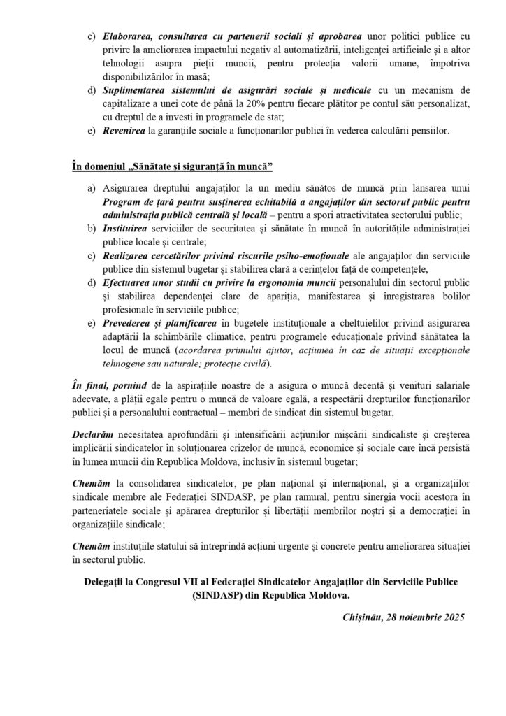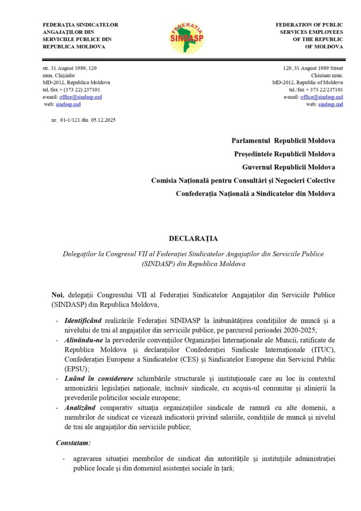 Declarația delegaților la Congresul VII al Federației Sindicatelor Angajaților din Serviciile Publice (SINDASP) din Republica Moldova, care este adresată Parlamentului Republicii Moldova, Președintelui Republicii Moldova, Guvernului Republicii Moldova, Comisiei Naționale pentru Consultări și Negocieri Colective, și Confederația Națională a Sindicatelor din Moldova.