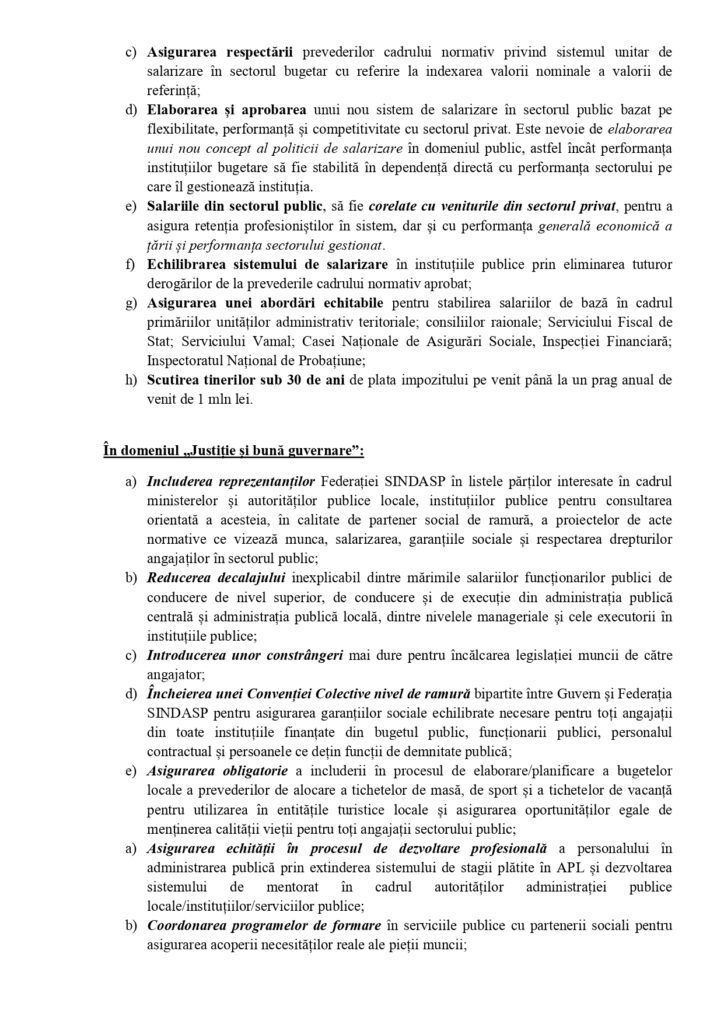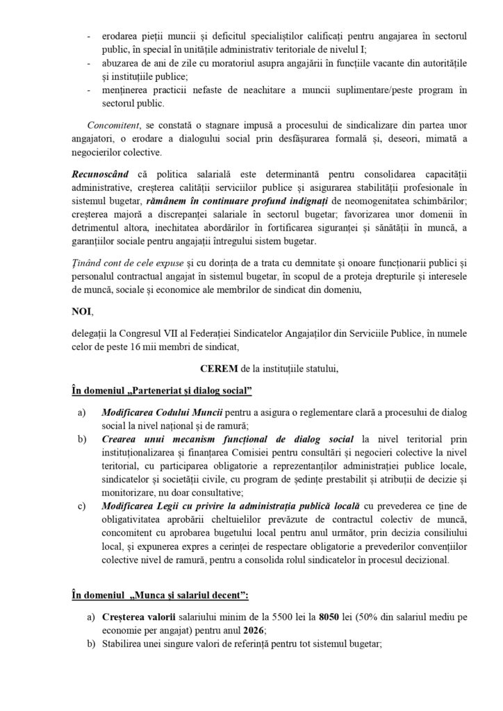 Totodată au solicitat asigurarea unei munci decente, a unor venituri salariale adecvate, respectarea principiului plății egale pentru o muncă de valoare egală, precum și garantarea drepturilor funcționarilor publici și ale personalului contractual – membri de sindicat.